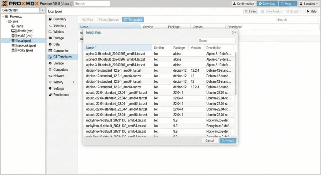 Pré-requisito: você precisa ter um template de container disponível em algum storage. No Proxmox, templates são arquivos tar e podem ser baixados pelo GUI ou pelo comando pveam.