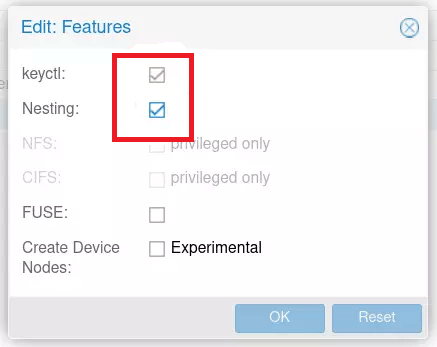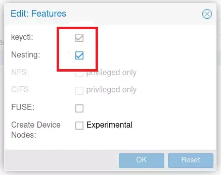 keyctlem CT → Options → Features. Em CT unprivileged, o Proxmox documentakeyctl=1como necessário para Docker. Nesting: habilite se você precisar de funcionalidades “de container dentro do container” (ex.: alguns cenários com systemd/Docker).